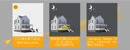 功能二:夜晚感应器自动启动。当有人进入感应区,照明灯具自动开启。
